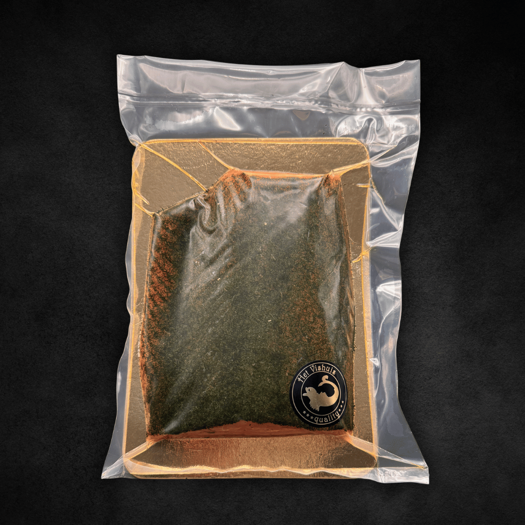 Ein Meisterwerk (700-1000g) aus der skandinavischen Tradition. Seit dem Mittelalter gehört Gravad Lachs zum kulinarischen Erbe Skandinaviens. Seine Rezeptur ist Tradition, beinahe heilig. Het Vishuis veredelt den Lachs mit einer eigens entwickelten Pökelmischung, die dem Fisch seine tiefrote Farbe zurückgibt und für eine angenehm kompakte Textur sorgt.