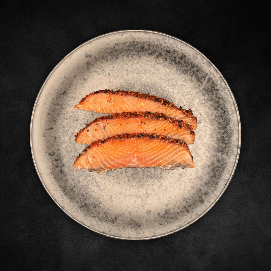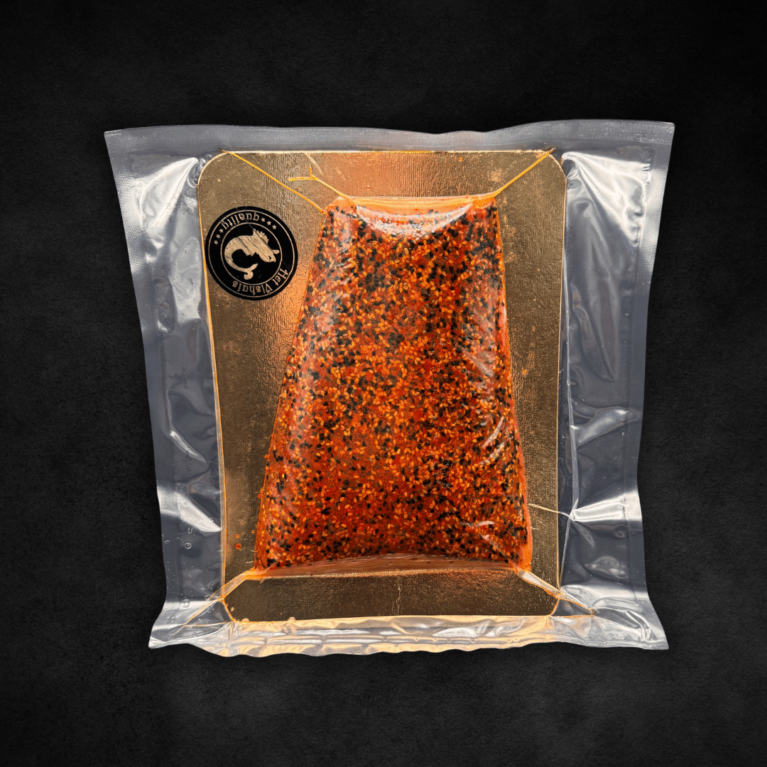 Feinster Lachs (700-800g) mariniert mit der aromatisch-würzigen Cha Siu-Sauce, die traditionell für chinesisches Röstschweinefleisch verwendet wird, erhält dieser Lachs eine unverwechselbare Tiefe. Die feine Süße der Marinade trifft auf pikante Chilinoten und wird durch gerösteten Sesam perfekt abgerundet. Das Ergebnis: ein Lachs mit intensivem Geschmack, zartem Biss und exotischer Raffinesse.