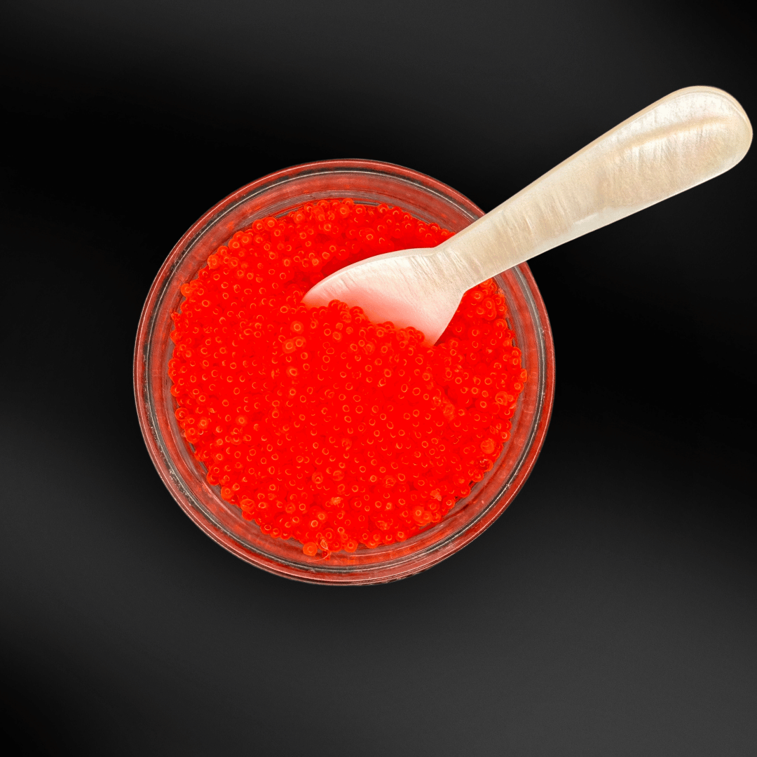 Die leuchtend roten Perlen aus wildem Fliegenfischrogen beeindrucken nicht nur durch ihre elegante Optik, sondern auch durch ihren intensiven Chili-Geschmack. Ihre knackige Textur und die leichte Schärfe machen diesen Kaviar zu einem besonderen Highlight. Seine leuchtende Farbe und der charakteristische Geschmack machen ihn zu einem unverzichtbaren Bestandteil in der kreativen Küche.